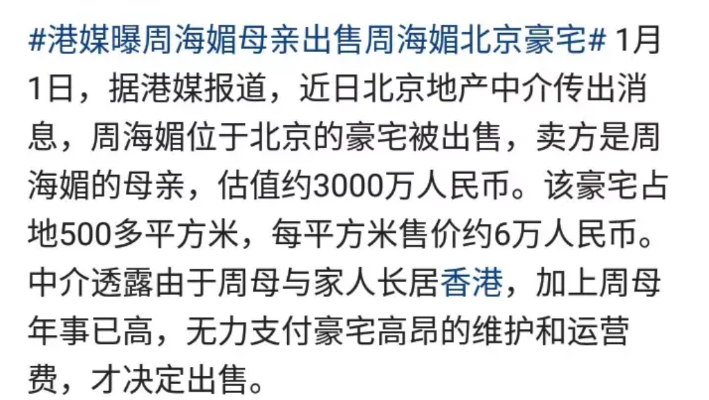 据知情东谈主自满,周海媚的母亲在男儿蚀本后,承受了巨大的哀悼。这位老迈的母亲居住在香港,关于北京的这座豪宅的不休彰效力不从心。豪宅面积庞杂,襄理和运营的用度极高,这关于一位老迈的母亲来说无疑是一个千里重的职守。